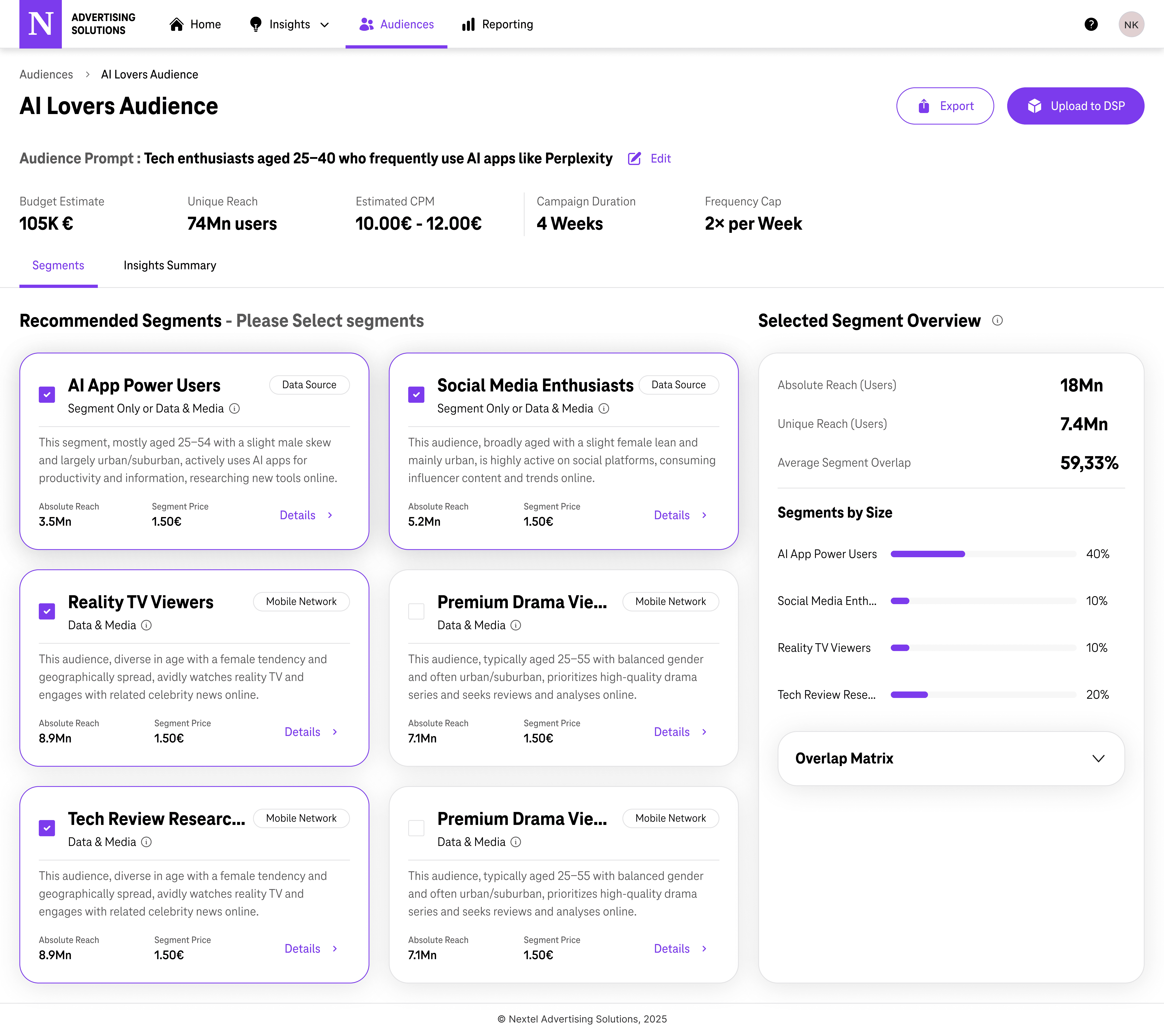 Nextel had been sitting on one of Europe's largest first-party datasets for years - 27M+ mobile contracts, 17M+ broadband connections, 4.5M Nextel TV households. None of it was being used to help agencies plan better campaigns. I led the product design and strategy to change that - from a rough internal proof of concept to a platform that handled $5M in ad spend within two quarters of going to market.