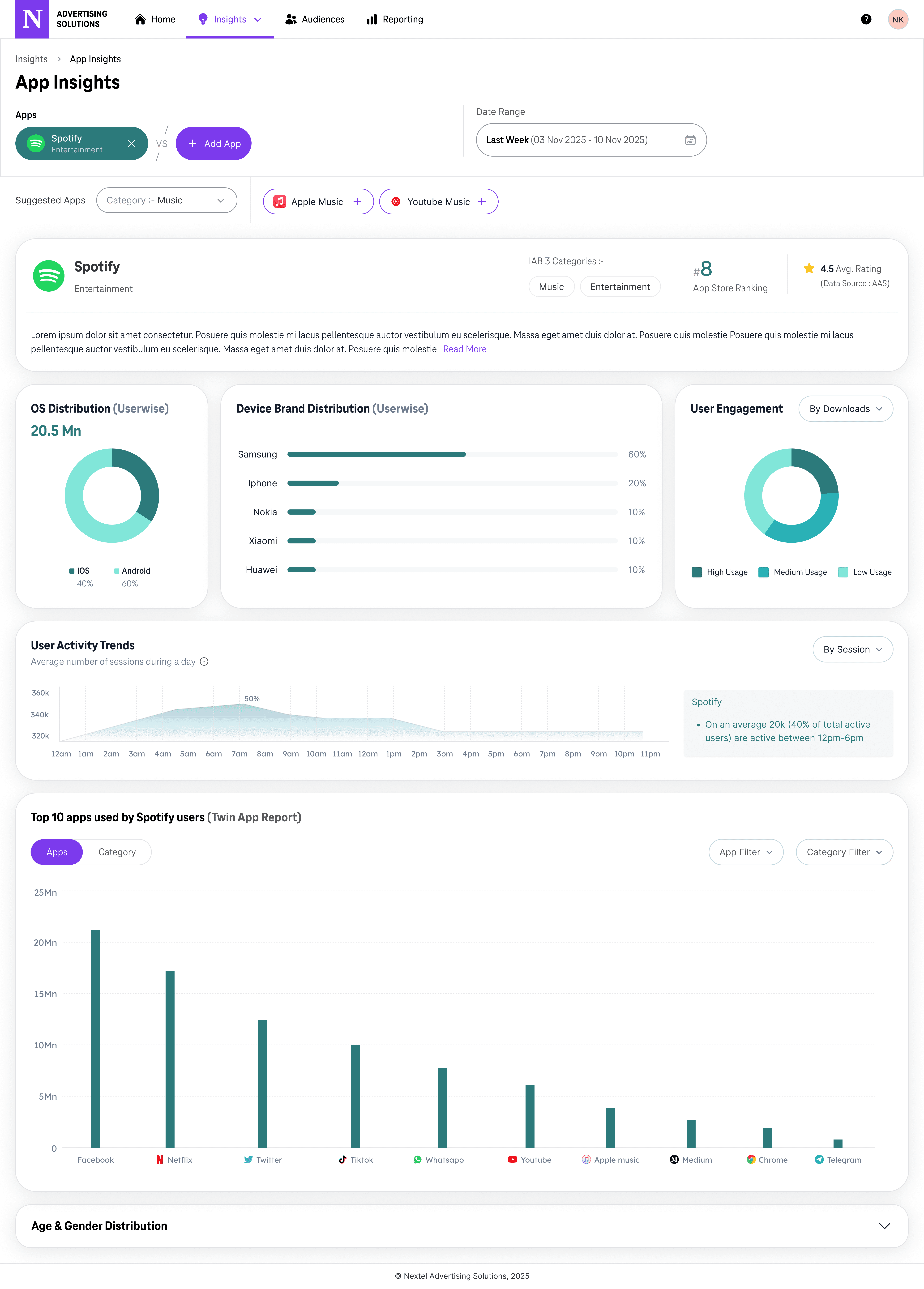 We stripped it back significantly. Instead of landing straight into a dense four-tab view, App Insights now opens on a search field and a Top 10 Trending Apps list — something useful immediately, no context required. The detail page became a single scroll: app overview, three key stats, activity trends, and the Twin App Report (what else do these users use?). We dropped the Recommendation tab entirely and cut about 60% of the content that was getting ignored.