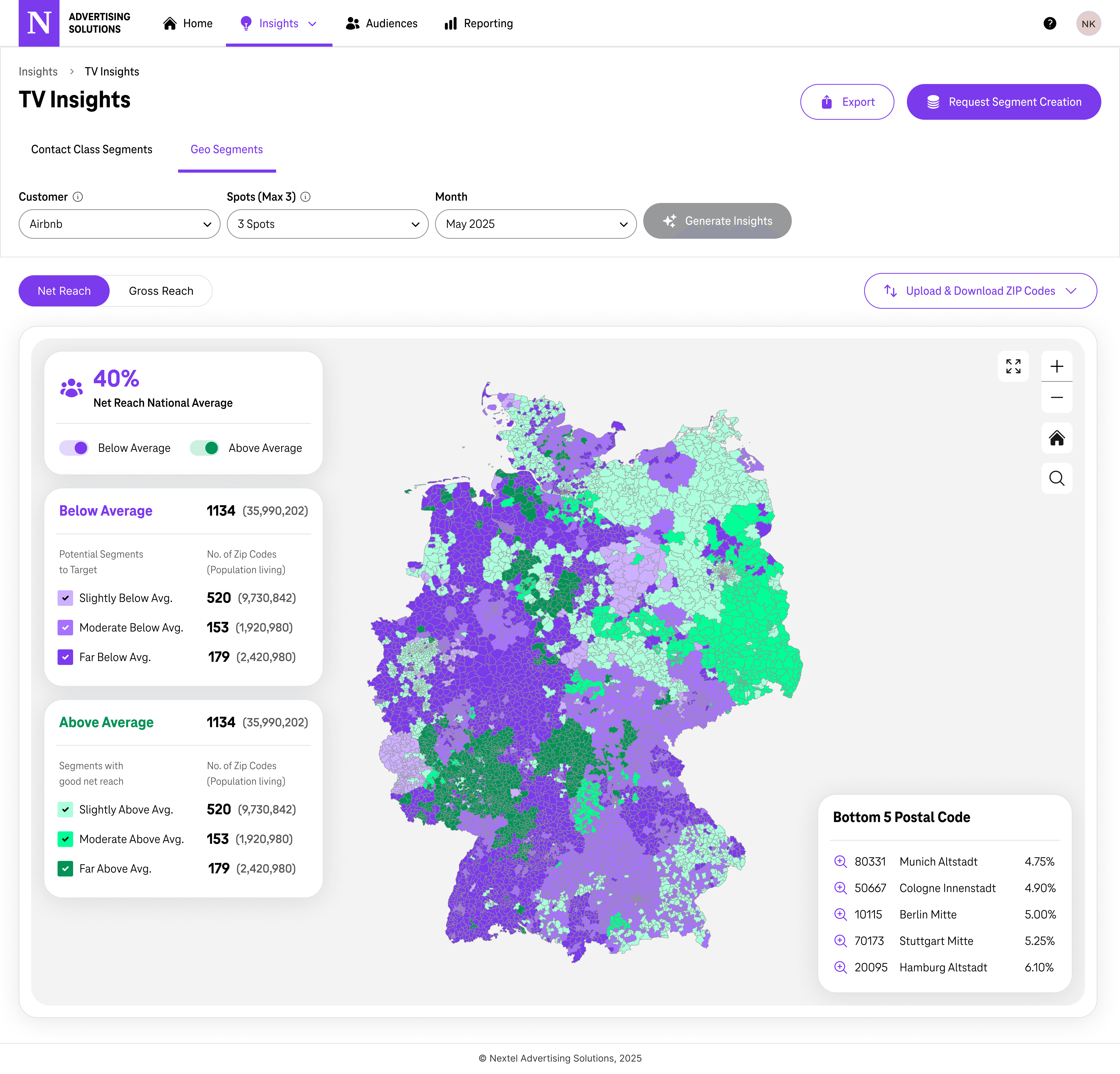 We added a full Germany GeoMap to TV Insights - choropleth at zip-code level, showing net reach above or below the national average in each area. Agencies could upload their own ZIP codes too. And we put the "Request Segment Creation" button right on the map, so the jump from "I can see this area underperformed" to "let me target it differently" became one click.